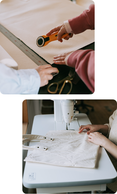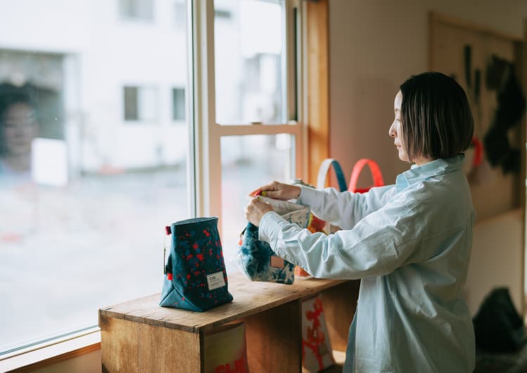 過剰生産を避けロスや廃棄を必要最小限にすべく、材料の選定~生地幅に合わせたパターンや工程の工夫など全工程で探求を続けています。