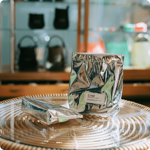 廃棄削減のため、ペイント加工で生地のバリエーションを展開。単なる新しさの追求ではなく、一種類の材料を大切に使い切るCXM独自の工夫です。