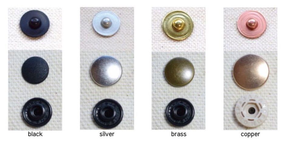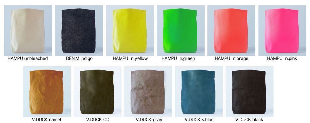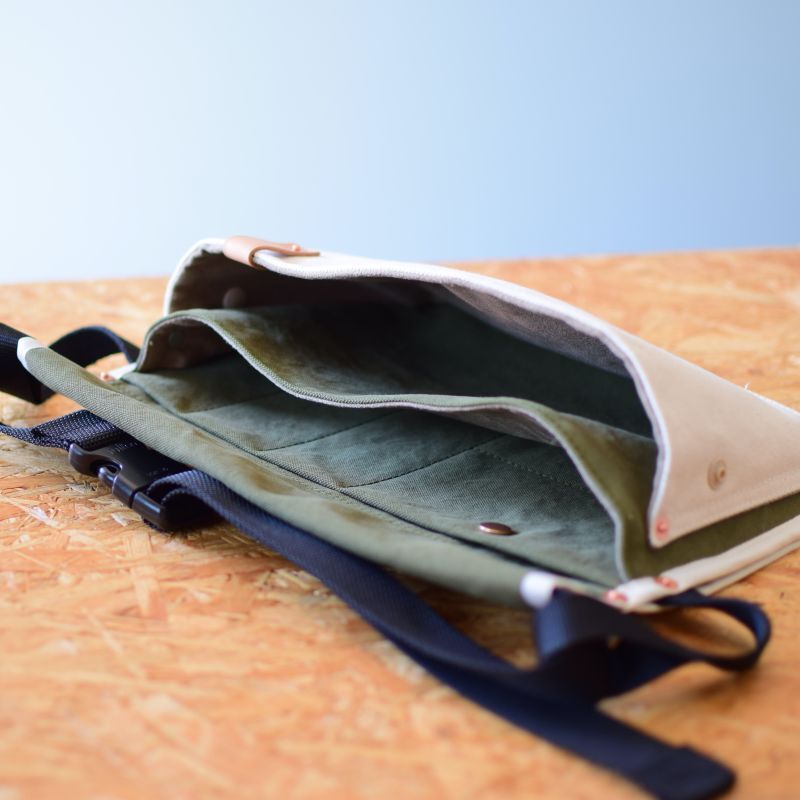 ベース生地、手前のポケット生地、ステッチ色、リベット色、プリント色をお選び頂けます。(端のパイピングは生成りのみです)
