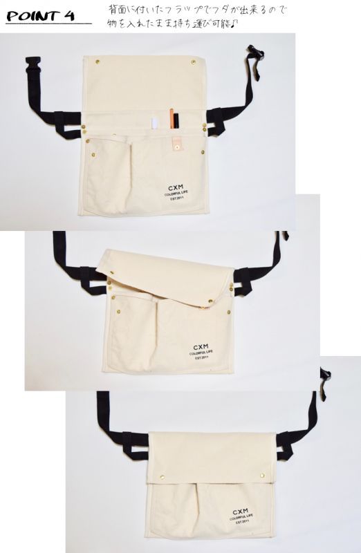 背面に付いたフラップを前に持ってくる事で蓋が出来るので、物を入れたままで持ち運びが出来ます。