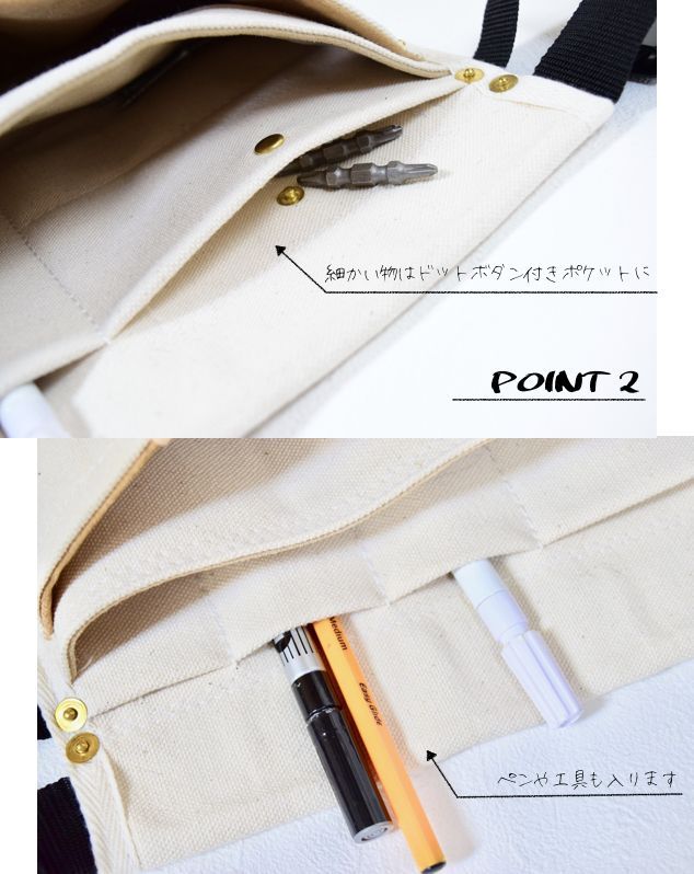 ポケットは深めと浅めの2口が付いているので、ビスなどをサイズ違いで分けたりと便利に使えます。
