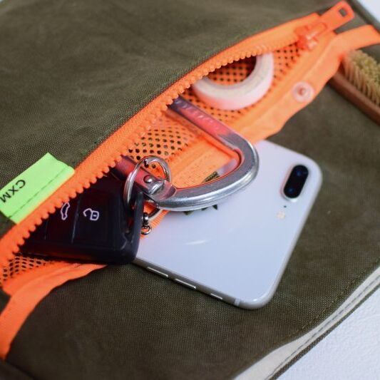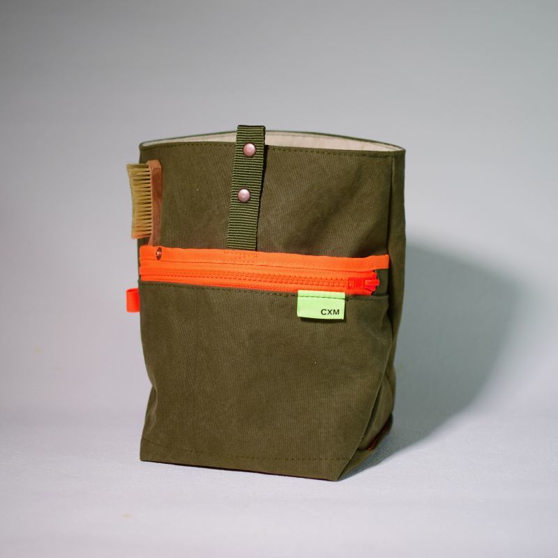 底の生地を二重にし、底に重心をおくことでチョークバッグが倒れることを防ぎます。物を入れることでより安定します。