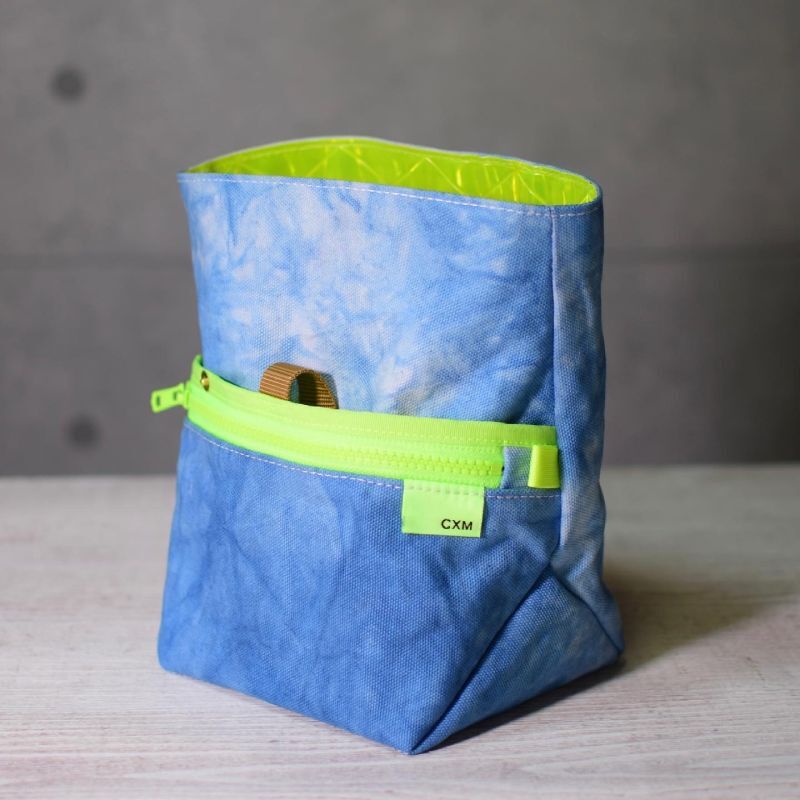 底の生地を二重にし、底に重心をおくことでチョークバッグが倒れることを防ぎます。物を入れることでより安定します。