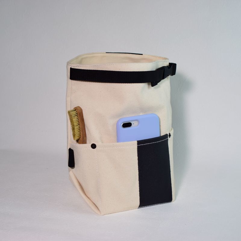底の生地を二重にし、底に重心をおくことでチョークバッグが倒れることを防ぎます。物を入れることでより安定します。