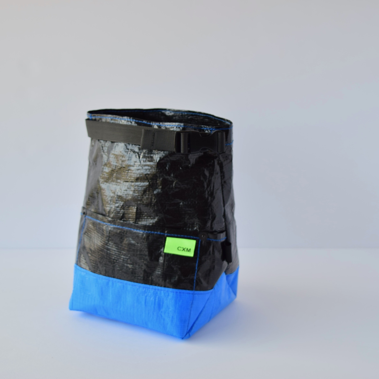 底の生地を二重にし、底に重心をおくことでチョークバッグが倒れることを防ぎます。物を入れることでより安定します。
