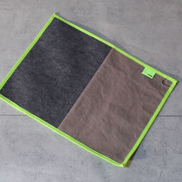 荷物が多くなる岩場へのアクセス時に少しでも持ち運ぶことへの負担を減らすことをに重点を置き、シューズマットとして最低限の機能を持ちつつ持ち運びやすい素材として選択しています。