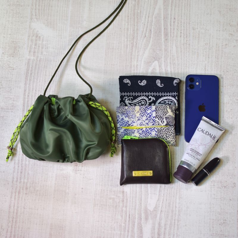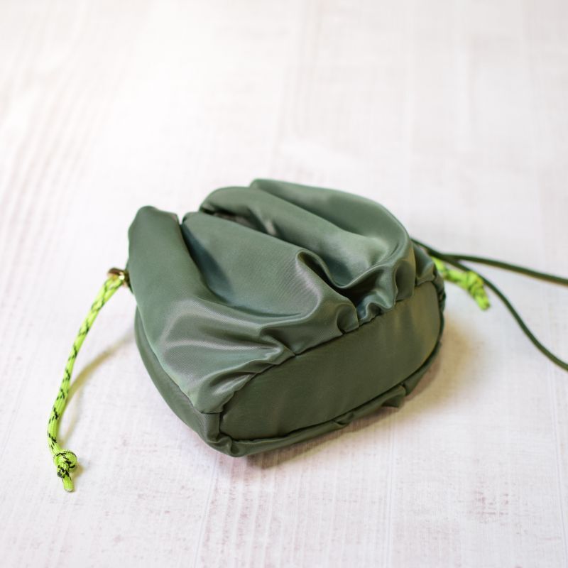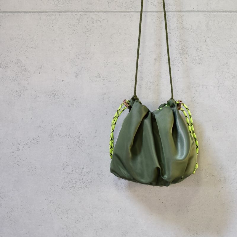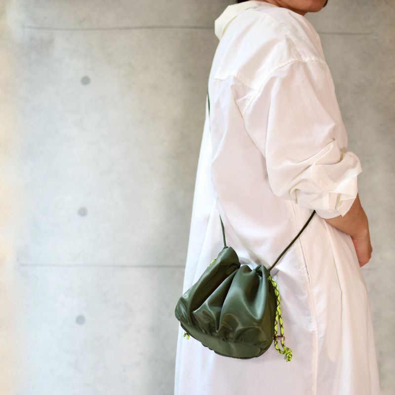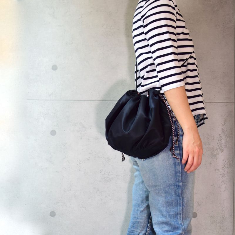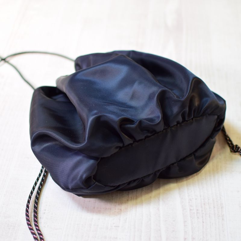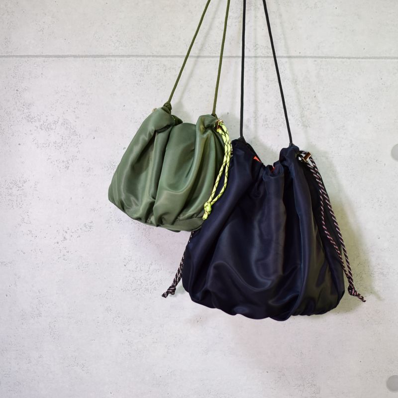 アメリカ空軍のフライトジャケットを起源に持つ『MA-1 』高密度で織られた厚みがあり、撥水性のある高機能ナイロン素材です。上質な光沢感を活かし、ギャザーをたっぷりと取った巾着ポシェットに仕上げました。