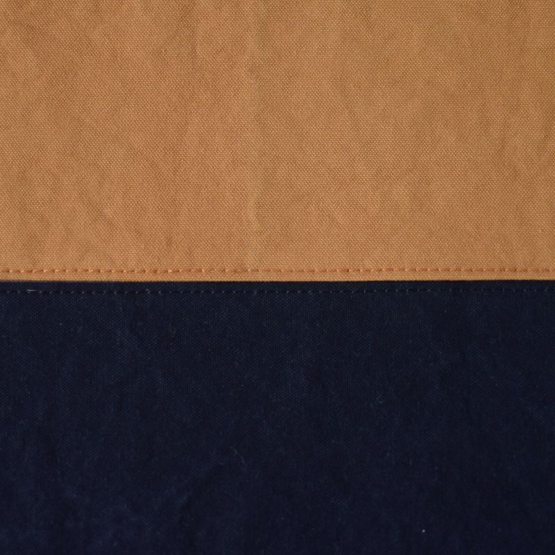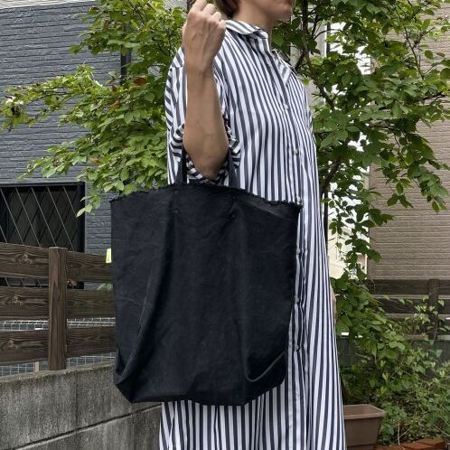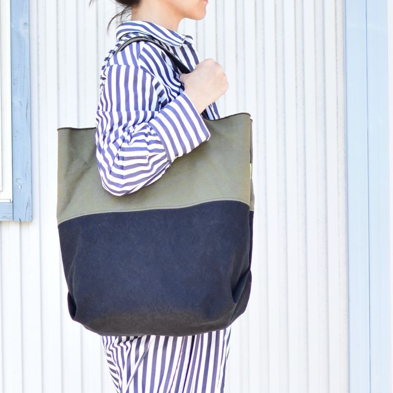 細い糸を高密度で織り上げることで再現されたしなやかなハリと強度のある生地だからこそ、軽やかでありながら存在感のある佇まいが生まれます。無骨ながらもヴィンテージのような風合いの生地の魅力を、文字通り余すことなく端から端まで活かしたデザインのトートバッグ。
