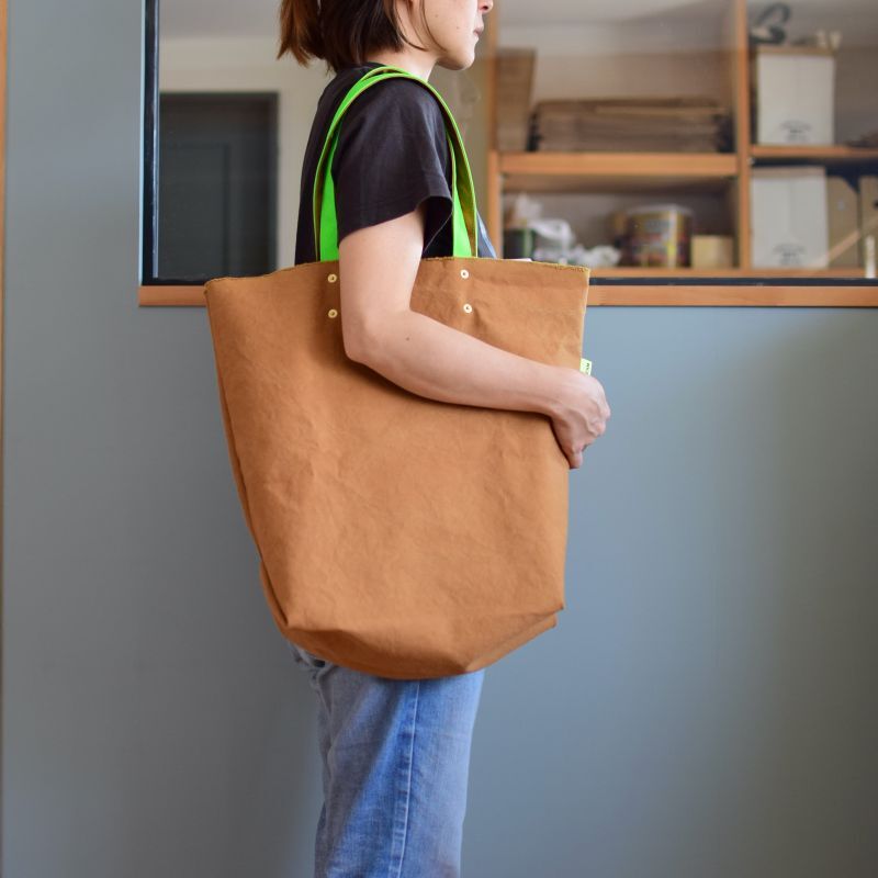通常は捨てられる生地端をバッグの口部分に使用し、本体脇以外には縫い目のない生地の重なりを極力減らした特徴的なパターンは、裁断クズが出ず、とても軽いのも特徴。