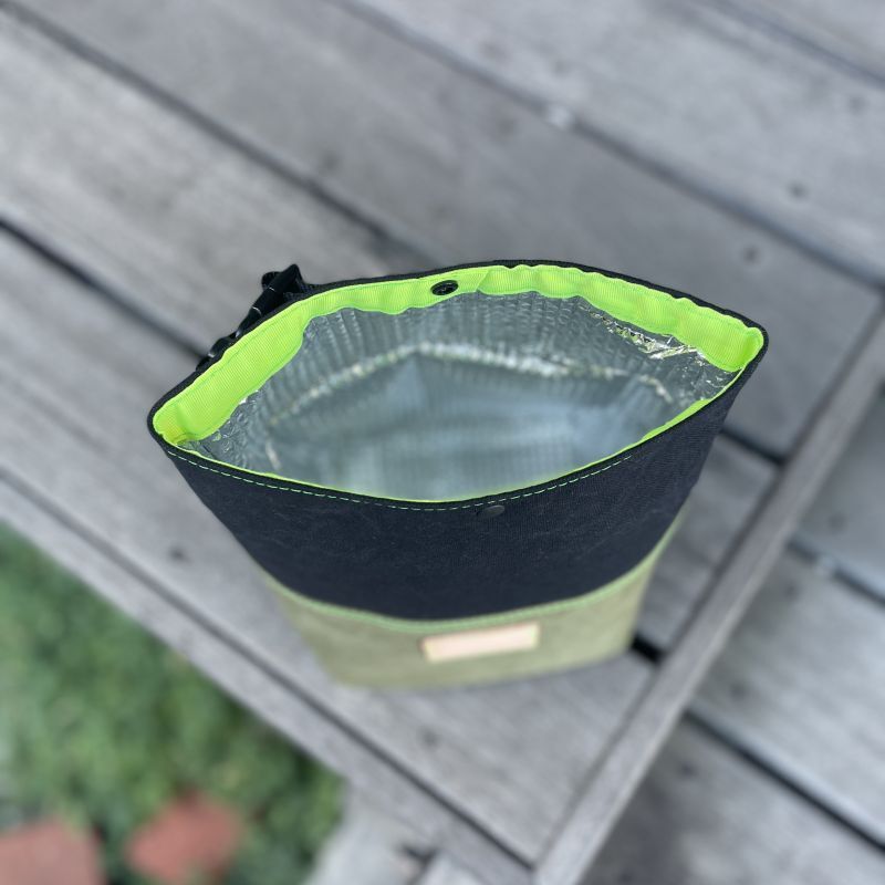 くるくると巻いて口を閉じることで、保冷力をキープ。ベルト部分はハンドルになるので持ち運びにも便利です。巻く回数を調節することでお弁当のサイズに合わせてサイズをアレンジ出来ます。