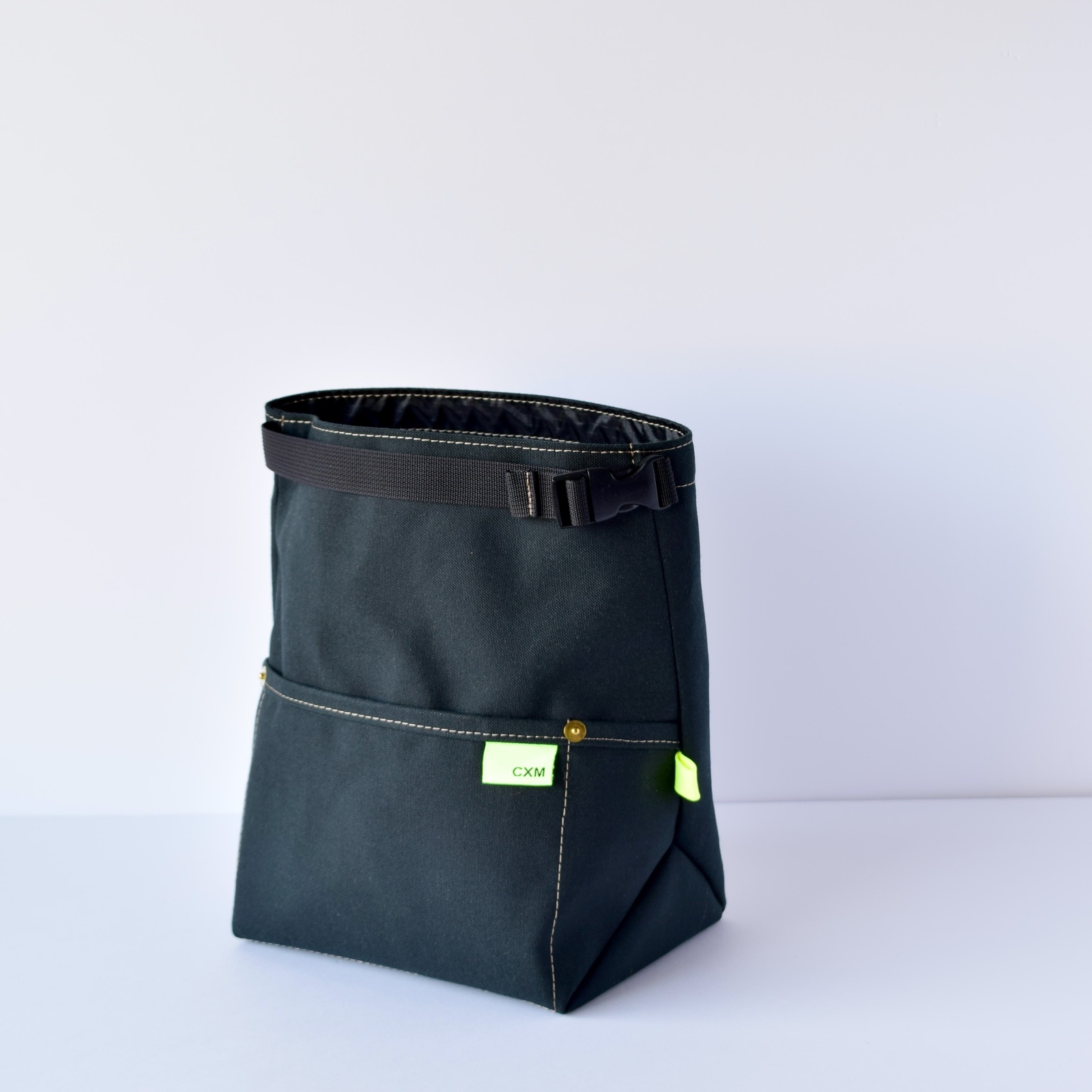 底の生地を二重にし、底に重心をおくことでチョークバッグが倒れることを防ぎます。物を入れることでより安定します。
