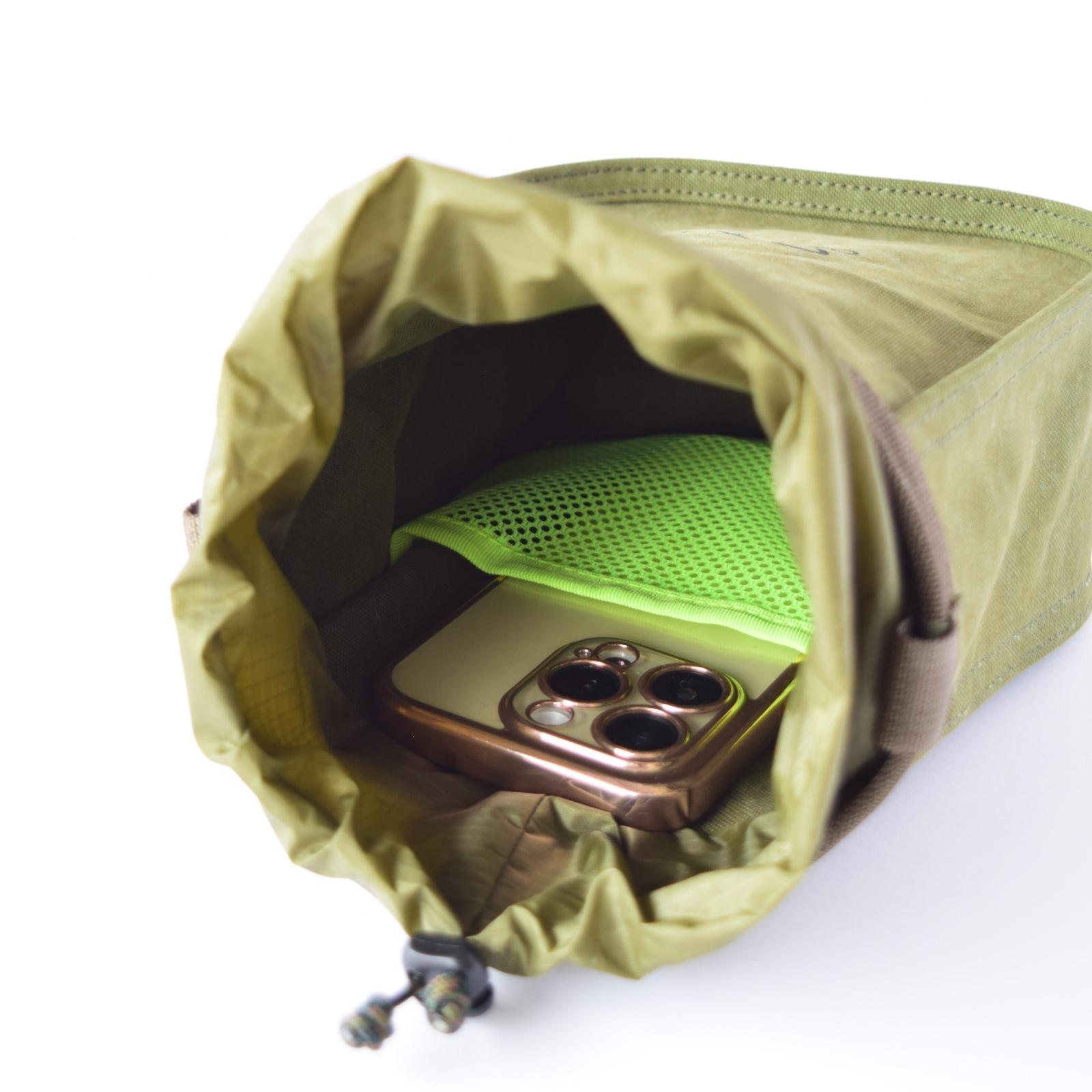 チョークバッグと同じ、巾着のように開閉出来る構造。撥水ナイロンを使用しいているので、多少の雨でもへっちゃらです。