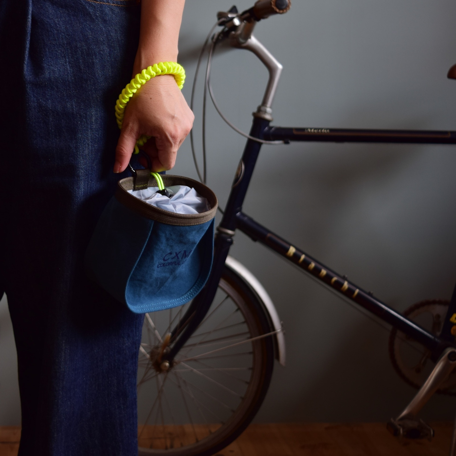 CXMで人気のチョークバッグ特徴的なフォルムを持つBELL BAGをベースに自転車のハンドルに取り付けるステムバッグに仕上げました。
